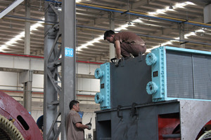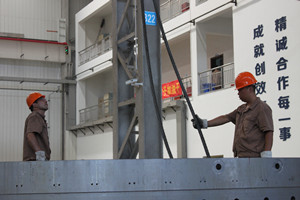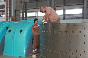 在金裝車間里,一個個忙碌的身影融入到搶進度,保生產的戰斗中,迎著高溫,默默地工作著。為了趕工期,加班加點已是家常便飯,為了確保安全作業,他們嚴格遵守各項安全操作規程。楊金山,在青田高崗項目的轉輪立式平衡動作試驗上為趕進度主動延長工作時間,還有在轉子中心體立式平衡試驗上一絲不茍、精心操作的王忠強,還有克服疲勞、連續工作完成5萬轉子嵌線的朱志君、陳捷、王銘明等等,都留下了他們辛勞的背影。走進車間的裝配區塊,我們感受到工作環境炎熱,發貨工期緊張,留給車間員工的時間非常的窘迫。生產必須圍繞市場轉,裝配作為公司產品產出的最后一道程序,車間進行了周密的安排,派出精干人員負責,各項工序都要井然有序,保質保量的完成。一線員工們冒著酷熱試車、油漆、裝箱,許多員工放棄了休息時間,加班加點地搶進度,正是因為有這些敢于和高溫進行戰斗的突擊隊員,才保證了公司正常的發貨需要。