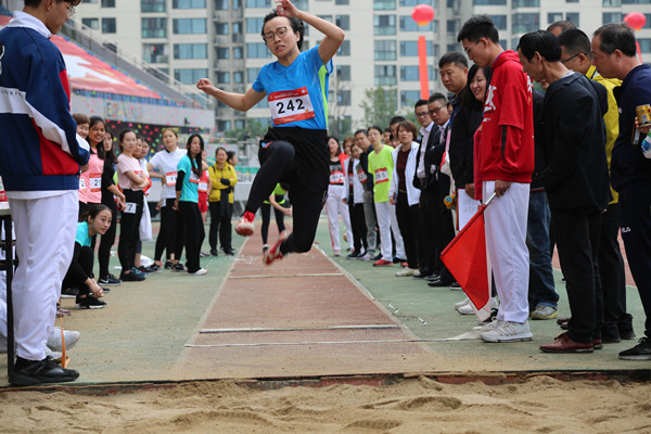 騰空一躍的瞬間,跨越的不是距離,而是超越的自己。上午10時左右,女子甲組跳遠比賽開始,“營銷新星”楊慧再次出戰。作為項目的紀錄保持者,相隔多年,楊慧再次的縱深一躍便值得我們為她鼓掌。比賽前,她做足了準備,賽前熱身力求達到最大的爆發點,隨著裁判員的一聲“242跳”,只見她猛地一發力,一陣有力的助跑,踏板起跳,騰空躍起,舒展出雙臂,邁開一雙大長腿,像超人似的穩穩落下,落下沙坑時的那一瞬間便是她再次打破杭汽輪集團職工運動會紀錄的時刻。“哇,這么遠……”這目視的距離引起周邊觀眾的一陣驚嘆。4米04!她超越了自己,打破了自己十年前4米01的紀錄,面對如此優異的成績,楊慧卻表現出異常的平靜,因為這早已不是他第一次在賽場上取得冠軍并破紀錄的好成績。從2008年到2018年,連續三屆集團運動會的田徑場上都會出現她的身影,楊慧一直都熱衷于參加運動項目,因為她十分享受在賽場上超越對手、超越自我的感覺,享受那一種被她稱之為是“拼搏”的精神。