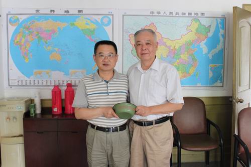 6月24日下午,杭發(fā)廠退休職工、原勞動服務公司經(jīng)理戴自琳來到公司總經(jīng)理孟中惠的辦公室,他滿懷激情地拿出了里一層用報紙、外一層用黃色綢緞包裝好的珍藏了54年的一只綠色搪瓷碗捐獻給公司,碗的外面用紅色的烤漆注上中華人民共和國第一機械工業(yè)部贈。綠色搪瓷碗顏色鮮亮,完好無損,紅色的大字醒目清晰,可見主人對這只碗的愛護和珍貴。