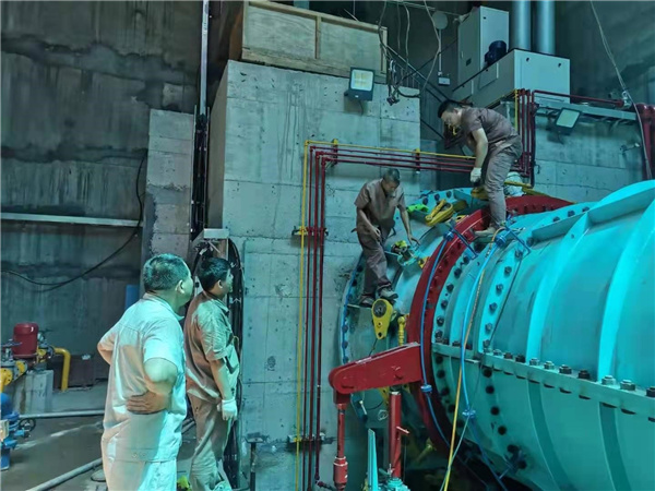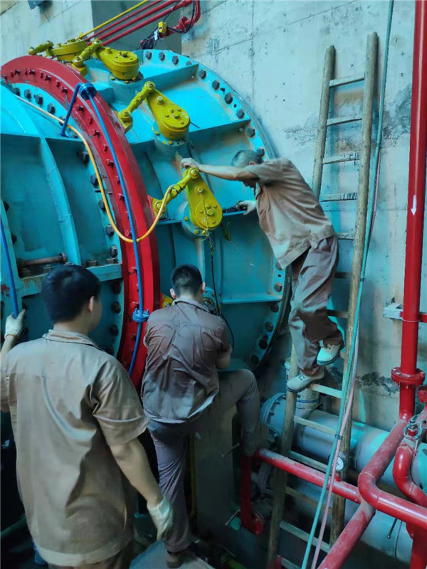 日前,公司為韶能集團(tuán)耒陽電力實(shí)業(yè)有限公司研制的軸伸貫流機(jī)組在電站安裝調(diào)時(shí)遇到技術(shù)難題。在重錘動(dòng)作試驗(yàn)時(shí),兩臺(tái)設(shè)備中的一臺(tái)出現(xiàn)重錘無法自然下落情況,且此時(shí)安裝單位基本撤出安裝現(xiàn)場(chǎng)。在得知現(xiàn)場(chǎng)情況及用戶的訴求后,公司想用戶所想,秉承顧客至上的原則,迅速召開了技術(shù)研討會(huì),分析現(xiàn)場(chǎng)問題可能產(chǎn)生的原因并制定相關(guān)的預(yù)案,召集技術(shù)處、用戶服務(wù)處、金裝車間車間幾名精兵強(qiáng)將趕赴現(xiàn)場(chǎng)處理問題。