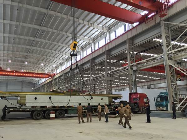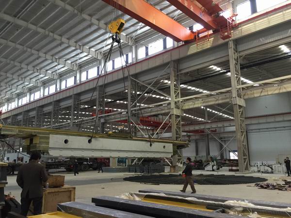公司新購的12.5米數控立式車銑床橫梁于11月初到廠,重達80余噸,行掛人員考慮其安全可靠的吊裝方式。
